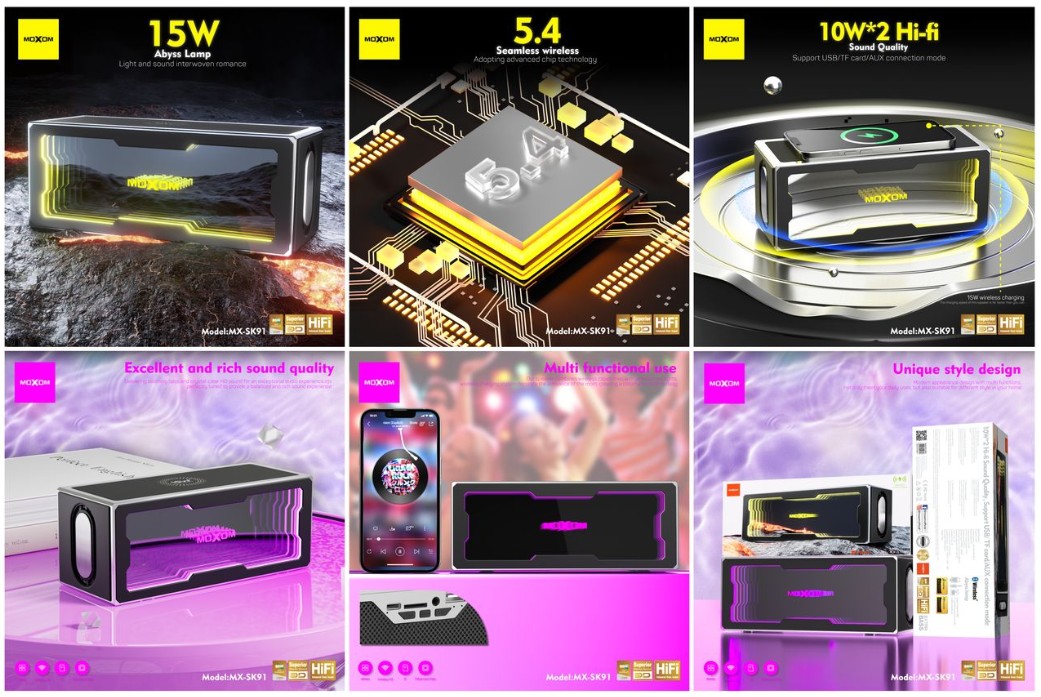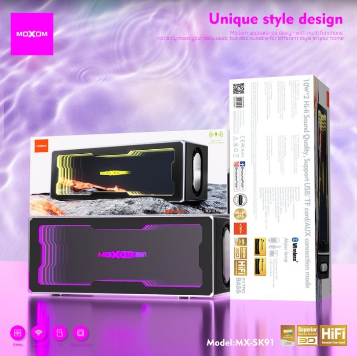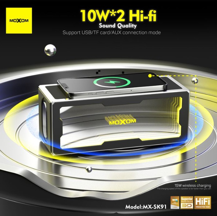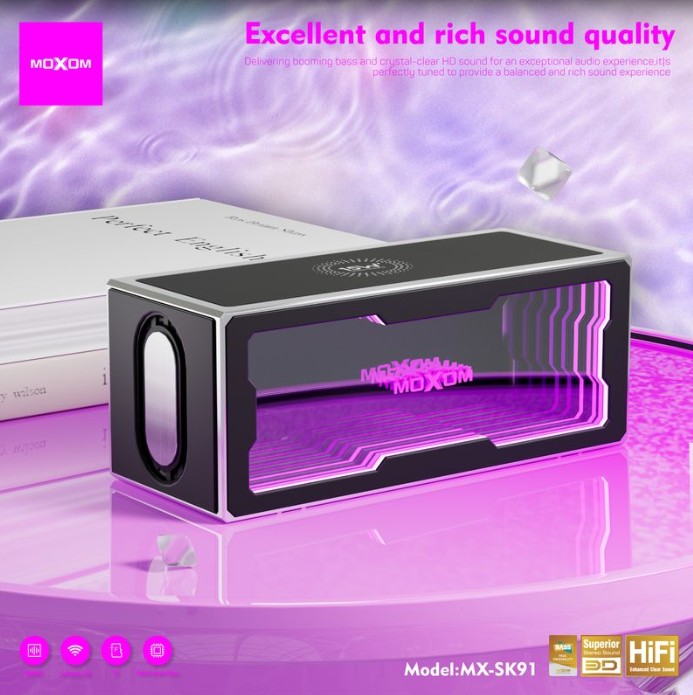 The MOXOM Abyss Light Wireless Charging Speaker MX-SK91 is a multifunctional device that combines high-quality sound with wireless charging and ambient lighting. Designed for modern lifestyles, this speaker not only delivers clear and powerful audio but also serves as a wireless charging station for compatible devices. The built-in ambient lighting enhances the atmosphere, making it perfect for bedrooms, desks, or relaxation spaces. Its compact design and advanced features make it a versatile addition to any setup.
