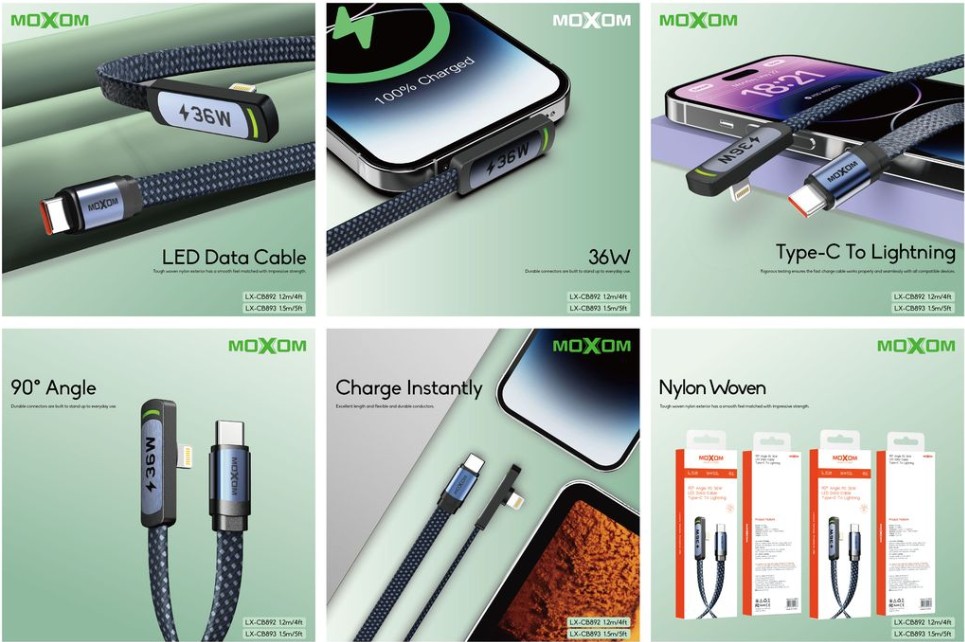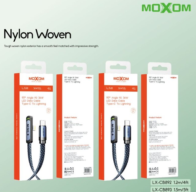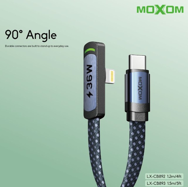 The MOXOM LX-CB893 is a high-quality 1.5-meter Type-C to Lightning cable engineered for Apple devices. With 36W fast charging support, this cable delivers safe and efficient power delivery when paired with a compatible PD charger. Its extended length provides flexibility at home, work, or on the go. Built with reinforced connectors and a durable jacket, it’s designed to resist wear and bending for long-term use.