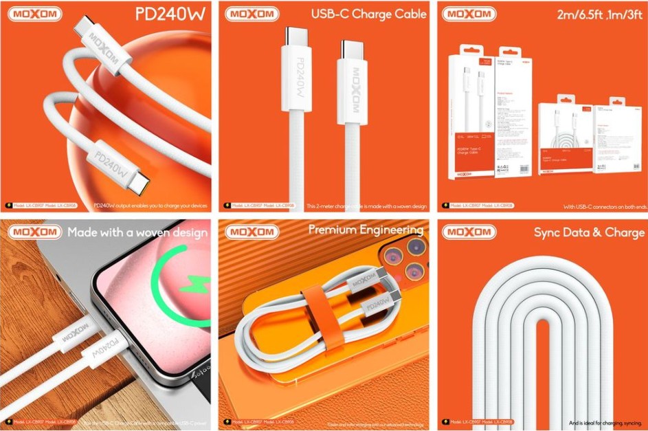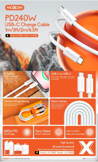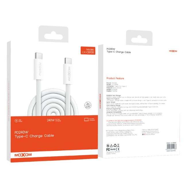 The MOXOM LX-CB908 is a premium 2-meter Type-C to Type-C high-power cable built for ultra-fast charging and data transfer. Supporting up to 240W Power Delivery, it’s ideal for high-power devices like laptops, tablets, and phones that require powerful PD adapters. Its long length makes it ideal for charging at a desk, in bed, or in the office without being tethered to an outlet.