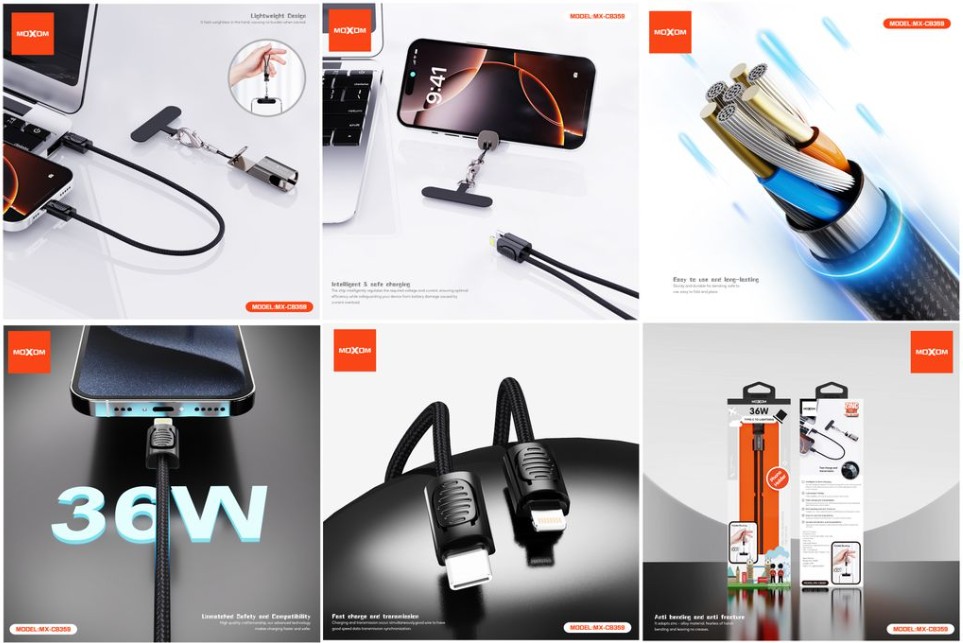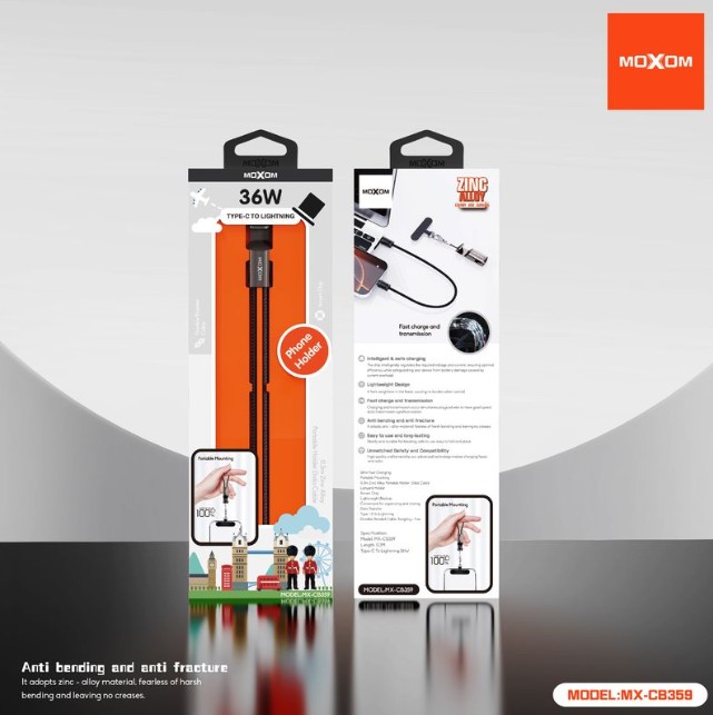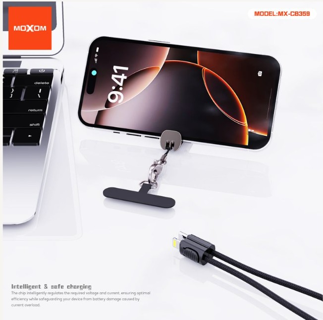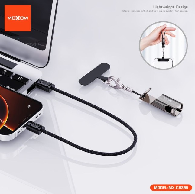 The MOXOM MX-CB359 3-in-1 Lanyard Cable offers universal charging and data compatibility for Type-C and Lightning devices in one handy cable. Designed with a lanyard for portability, this cable ensures you stay connected wherever you go.
