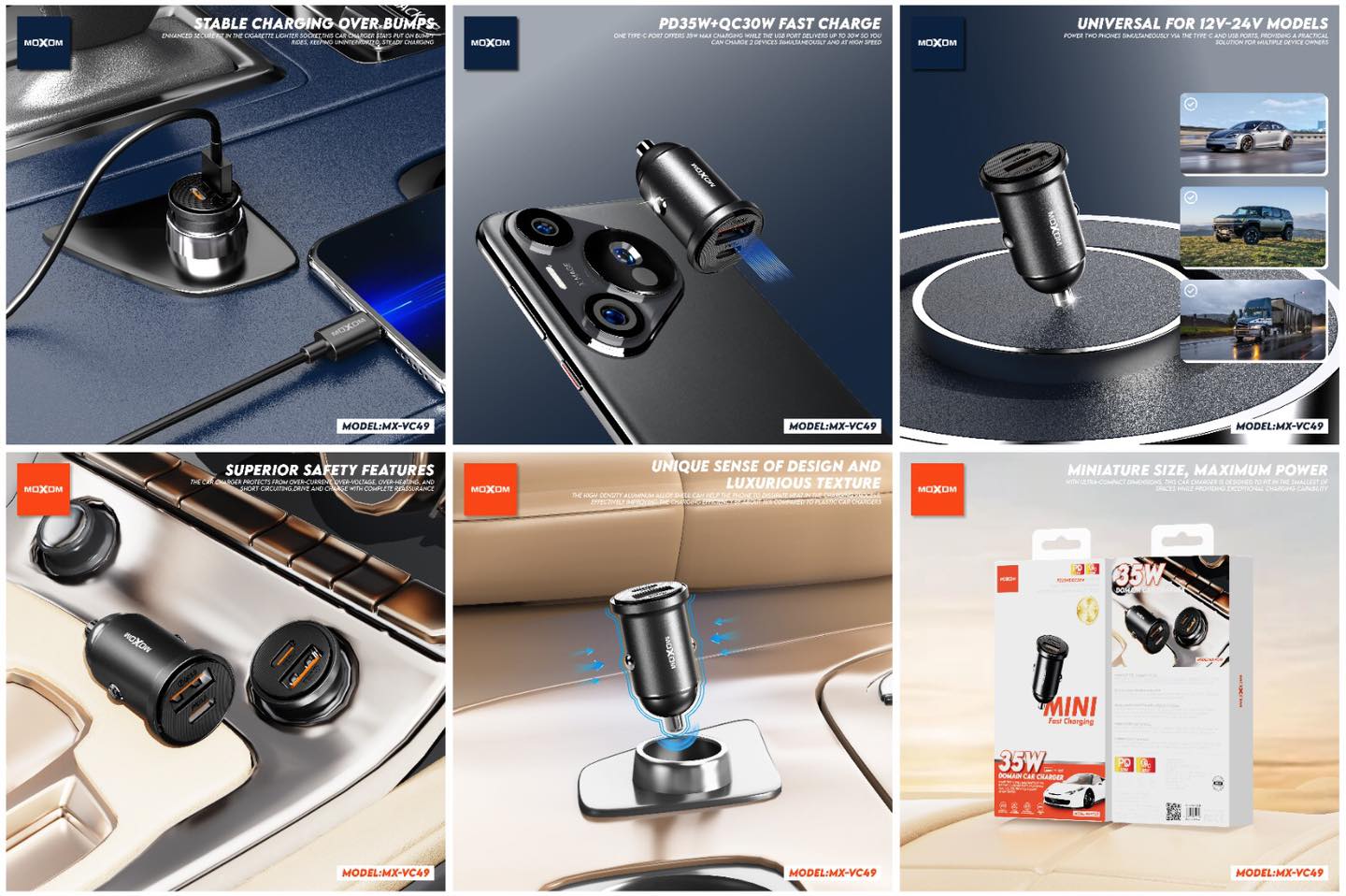 The MOXOM MX-VC49 Car Charger delivers fast, reliable, and safe charging for all your mobile devices while on the road. Featuring dual USB ports with intelligent power distribution, it allows you to charge two devices simultaneously without sacrificing speed or safety. Built with a compact aluminum alloy body, this charger offers superior heat dissipation and durability, making it the perfect companion for long drives and daily commutes.